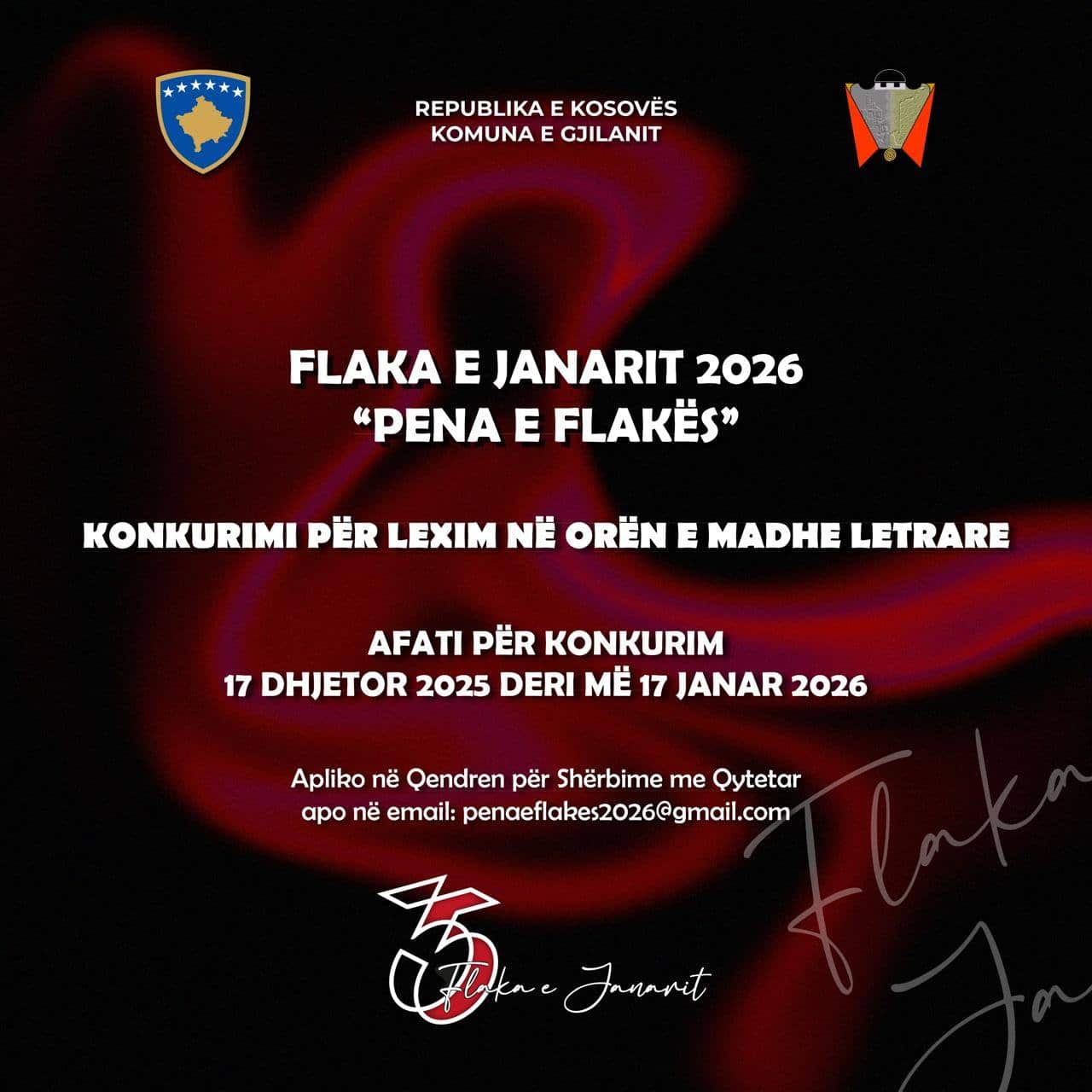 Komuna e Gjilanit, Drejtoria për Kulturë Rini dhe Sport në kuadër të Manifestimit kombëtar të kulturës “Flaka e Janarit 2026”, shpall konkursin tradicional letrar me qëllim të rritjes së cilësisë dhe vlerës artistike në Orën e Madhe Letrare të Manifestimit “Flaka e Janarit”,2026 e njohur tashmë si PENA E FLAKËS, si dhe përzgjedhjes më meritore të poezisë fituese, gjithë krijuesit e interesuar të hapësirave shqiptare dhe tjerët që jetojnë e krijojnë në Mërgatë , ftohen për të konkuruar si dhe, nëse përzgjidhen, për të ardhur e lexuar krijimet e tyre në Gjilan, duke u bërë pjesë e garimit të mëtejmë për Çmimin kryesor të pjesës letrare të Manifestimit.